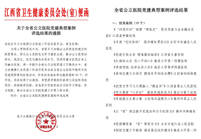 近日,江西省卫生健康行业党建工作指导委员会在全省公立医院中组织开展党建典型案例征集活动,捕鱼游戏 申报的党建案例《党员教育“六步法” 激发党建新活力》,在全省69个案例中脱颖而出,荣获优秀案例奖。