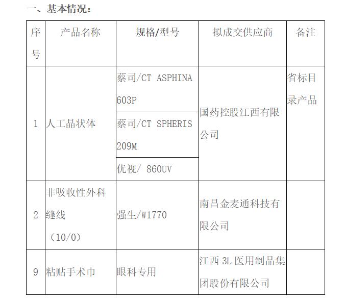 经2018年12月20日院内议价,就眼科手术耗材(人工晶状体、非吸收性外科缝线、粘贴手术巾)院内议价采购结果公示如下: