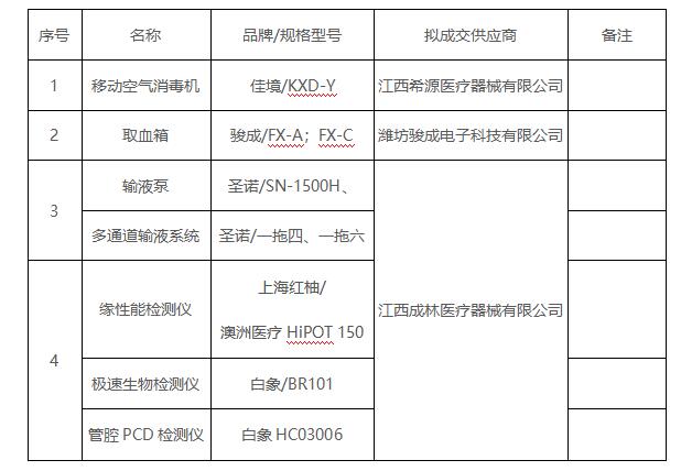经2018年3月22日院内议价,就朝阳院区移动空气消毒机、取血箱、输液泵、多通道输液系统、消毒供应室绝缘性能检测仪、极速生物检测仪、 管腔PCD检测仪院内议价采购结果公示如下: