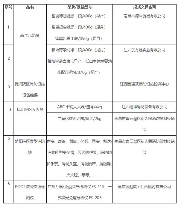 经2019年8月15日、8月16日、8月21日院内议价,就新生儿奶粉、抚河院区消防设施设备维保、抚河院区灭火器、朝阳院区微型消防站、POCT床旁快速检测仪、输血科全自动血型分析仪及配套试剂、一次性使用负压引流器院内议价采购结果公示如下: