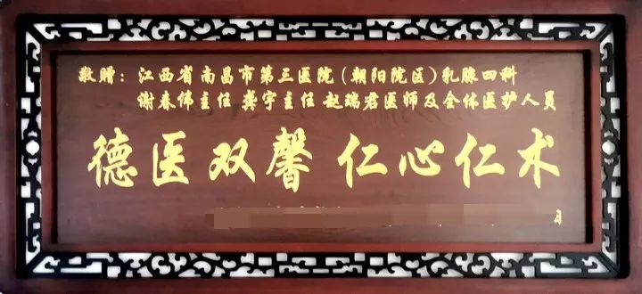 年过九旬的林奶奶(化名)是一位抗美援朝的老战士,在确诊乳腺癌后,一向坚强的她也陷入了恐慌之中。康复出院后,林奶奶和家属为表达对医护人员的感谢,特意送来一个牌匾,上面写道:“德医双馨,仁心仁术”。