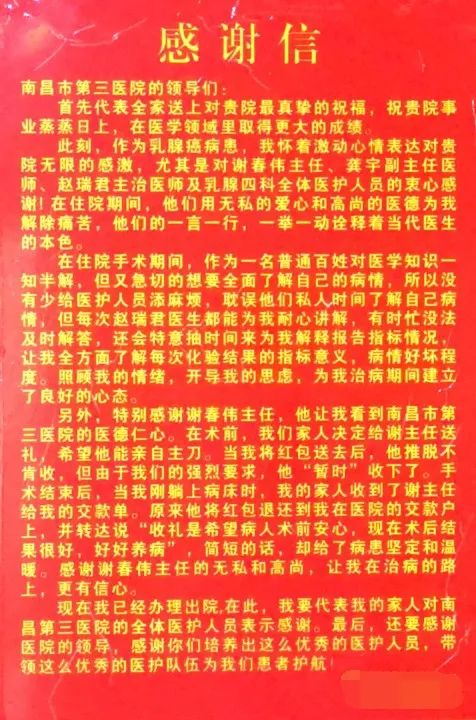 “我母亲年纪比较大,最开始确诊的时候十分恐慌,家属安慰也不管用,后来,在医护人员和老病友的鼓励下才慢慢树立信心,敢于面对病痛,感谢帮助过我母亲的每一位医生和护士!”