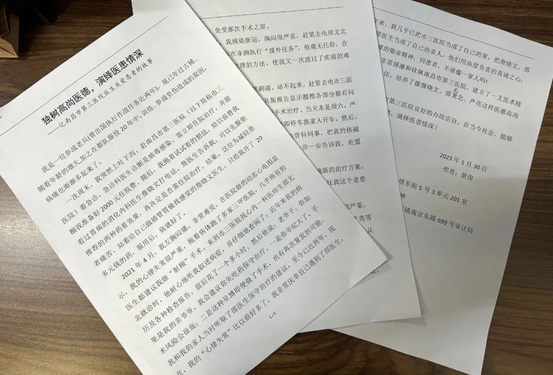这些年来,我几乎已把南昌市人民医院(南昌市第三医院)当成了自己的家,把詹晓文、邵尤北、严亮等医生当成了自己的亲人,他们高度负责的真诚之心、精益求精的敬业精神,真真切切把我们患者当成了自家人。