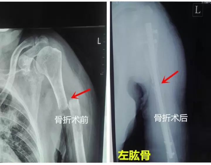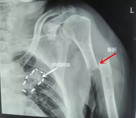 患者章奶奶今年74岁高龄,来捕鱼游戏 就诊后发现她的左肩膀剧烈疼痛,经捕鱼游戏 骨科初步检查发现章奶奶是晚期肺癌出现骨转移,左上臂肱骨出现了病理性骨折。(如图)。