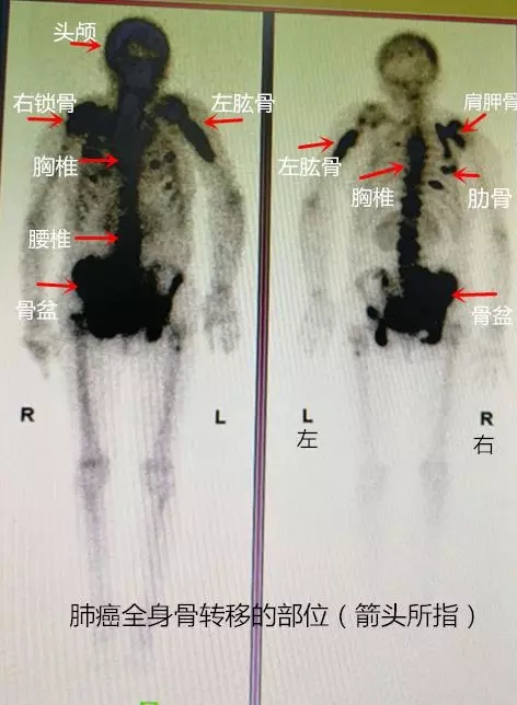 再对其全身进行全身骨扫描(SPECT)检查后发现:其头上,右肩膀上,腰上,背上都存在肺癌的骨转移(如图)。