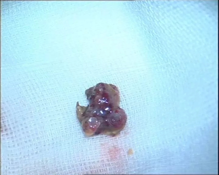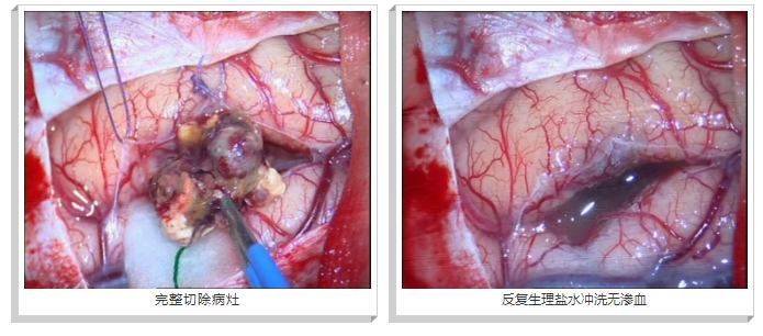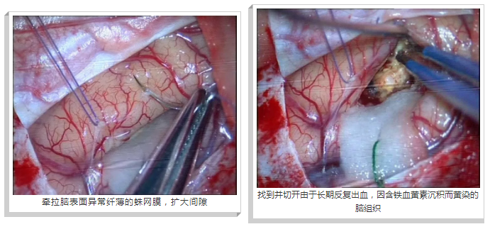 按术前计划,为最大程度减少损伤,保护脑组织,我们没有选择皮层造瘘,而是仔细显微分离脑沟回。牵拉脑表面异常纤薄的蛛网膜,扩大间隙找到并切开由于长期反复出血,因含铁血黄素沉积而黄染的脑组织,进一步明确病灶。