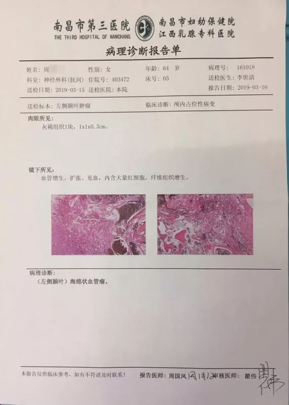 术后病理镜下可见血管增生、扩张、充血,内含大量红细胞,提示海绵状血管瘤。