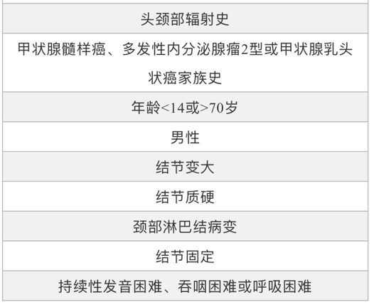 1.囊下或气管旁病变2.可疑淋巴结病变或甲状腺外侵犯3.有甲状腺癌个人史或家族史4.伴有并发症(如发音困难)5.结节高风险且直径≥10mm6.中等风险结节且直径≥20mm7.低风险结节直径>20mm,且结节不断长大,有高危病史,未进行甲状腺手术或微创消融治疗。