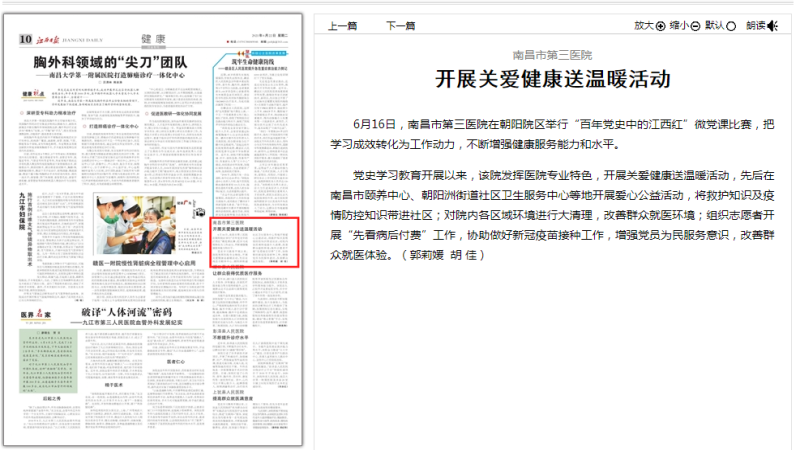 党史学习教育开展以来,该院发挥医院专业特色,开展关爱健康送温暖活动,先后在南昌市颐养中心、朝阳洲街道社区卫生服务中心等地开展爱心公益活动,将救护知识及疫情防控知识带进社区;对院内各区域环境进行大清理,改善群众就医环境;组织志愿者开展“先看病后付费”工作,协助做好新冠疫苗接种工作,增强党员为民服务意识,改善群众就医体验。(6月22日刊登于江西日报健康板块)