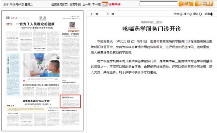 本报南昌讯 (卢元元 胡 佳)9月1日,南昌市首家咳喘药学服务门诊在捕鱼游戏 朝阳院区开诊,免费为咳喘患者提供用药咨询服务、进行规范的用药指导、药物重整、吸入装置指导及其他药学服务。在市级医疗机构***开展咳喘药学服务门诊,是捕鱼游戏 临床与药学深度融合的项目之一,不仅可以帮助患者正确、合理使用咳喘药物,还可以促进医药协同发展,深入交流,共同进步,利于多学科联合诊疗的建设。