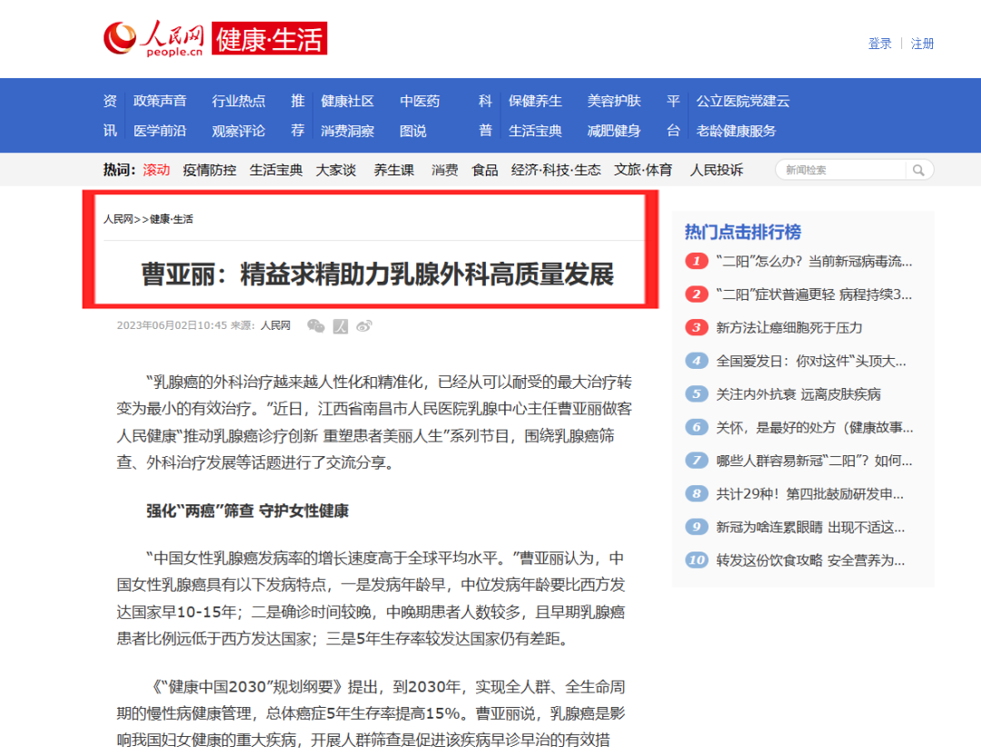 “乳腺癌的外科治疗越来越人性化和精准化,已经从可以耐受的最大治疗转变为最小的有效治疗。”近日,江西省南昌市人民医院乳腺中心主任曹亚丽做客人民健康“推动乳腺癌诊疗创新 重塑患者美丽人生”系列节目,围绕乳腺癌筛查、外科治疗发展等话题进行了交流分享。