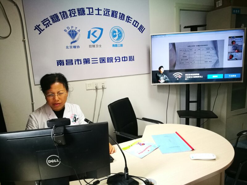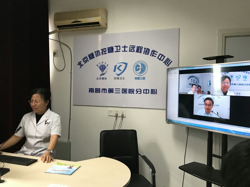 8月17日上午10点,在捕鱼游戏 “北京糖协控糖卫士远程协作中心”会诊室,副院长涂萍率内分泌代谢科的医生团队,正在为“控糖卫士”京赣糖尿病分级诊疗远程项目的协作体医院——进贤县三里乡卫生院的一位糖尿病患者进行特殊的会诊工作。这是依托“控糖卫士”的平台实现了捕鱼游戏 与远郊区县乡镇卫生院的首次直接临床会诊。