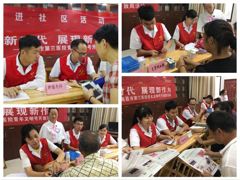 医院每个青年文明号集体结对一个社区,在青年文明号“号长“的带领下,定期组织志愿者到结对社区,开展“青蒿行动”,看望社区孤寡老人、空巢老人、行动不便居民等,志愿者们各自用所学医疗专长,上门送健康,关心他们的身体状况,指导他们进行有效康复锻炼、解答用药安全注意事项等,同时为生活困难的家庭还会送上米和油等生活用品。