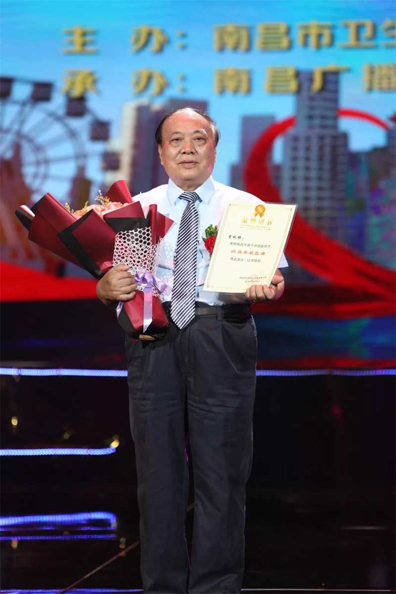 雷秋模、林鹤翔、杨文忠、衷诚任、阮安安、薛汉饶、黄莉、唐凤英、裴明玉九位医生获得“终身奉献医者”(排名不分先后)。雷秋模代表“终身奉献医者”获得者上台领奖。