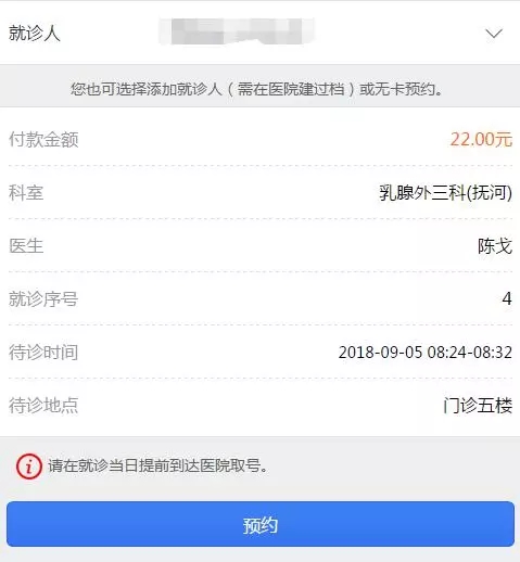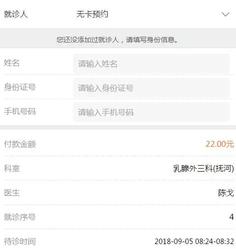 6.无就诊卡患者可选择“无卡预约”,填写就诊人信息后点击“预约”即预约成功。