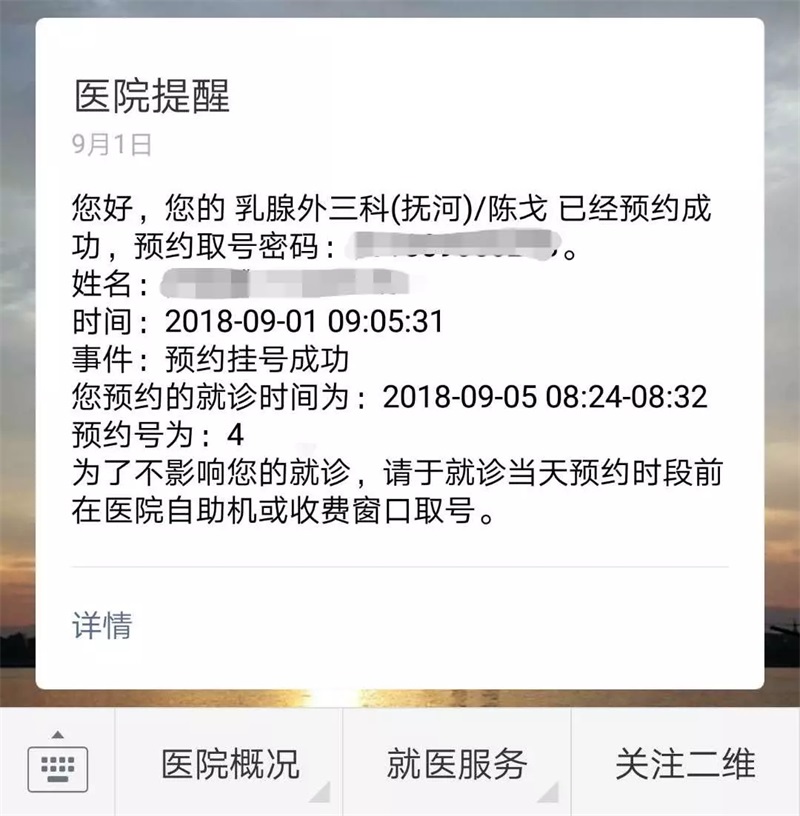 2. 已实名绑定的患者请于就诊当日提前到达医院,点击下图中的 “医院提醒”详情,可直接跳至第5步。