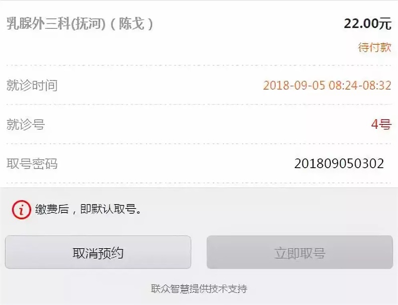 5.点击“立即取号”(仅就诊当日可点,无法提前取号)根据提示缴费后可直接至候诊区等待叫号就诊。无法微信缴费的患者需前往门诊大厅服务台出示预约成功信息,给予确认盖章、取号后至收费窗口缴费。