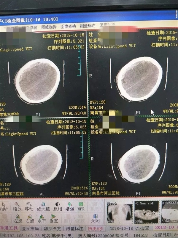 CT 检查完毕后直接送入医院神经外科,患者入科时神志深昏迷,无任何刺痛反应,伤情严重程度评分GCS 评分为最低分3分,双侧瞳孔散大,均无对光反应,病情异常危重,命悬一线,家属救治态度坚定,立即完善术前心电图检查,抽血化验,通知手术室,与家属交代病情,整个过程只有20分钟左右。