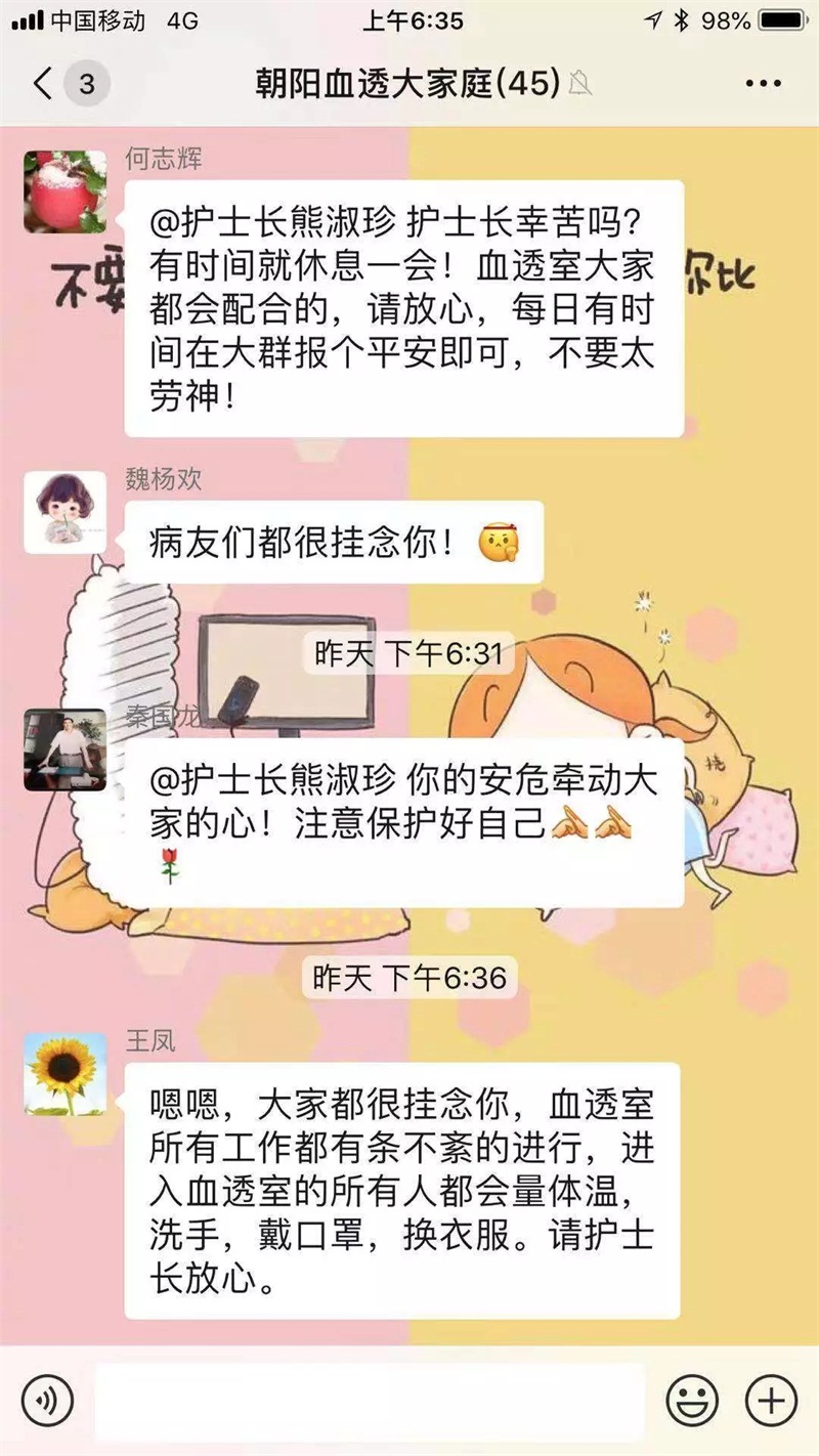 1月29日,今天一天都忙着与呼吸科的工作对接,物资、人员排班、病区格局、工作流程全部详细记录说明,忙到很晚。走出医院的大门,感觉丝丝凉意,竟觉得有一种幸福的感觉,如此清新的空气,冷一点又何妨!急忙翻开手机,发现在我们血透室的患友群里都是对我的关心和牵挂,一句句关心的语言,犹如一股春风扑面而来,顿时觉好暖啊,为了以后还能为他们护理服务,我怎样也要战胜困难,平安回家!