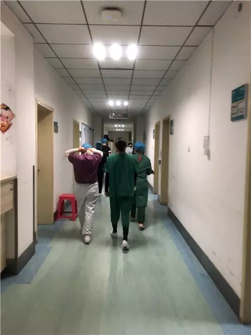 重症医疗组长程彬等人代表江西第一支援队支部书记王卓,副书记祝新根看望了累倒在工作岗位上的英雄,他爱人是五院行政管理人员,却因劳累而不幸感染新型肺炎。他们带去了江西第一援助队所有人的问候,并祝他早日康复。
