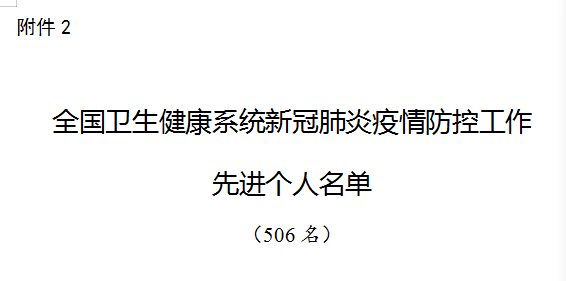 经各方面艰苦努力,疫情防控形势出现积极变化,向好态势不断拓展。为鼓舞士气,表彰先进,弘扬正气,激励广大卫生健康工作者投入这场严峻的斗争,国家卫生健康委、人力资源社会保障部、国家中医药管理局决定授予北京大学第一医院重症救治医疗队等113个集体“全国卫生健康系统新冠肺炎疫情防控工作先进集体”称号,授予丁新民等472位同志“全国卫生健康系统新冠肺炎疫情防控工作先进个人”称号,追授徐辉等34位同志“全国卫生健康系统新冠肺炎疫情防控工作先进个人”称号,获奖个人享受省部级表彰奖励获得者待遇。希望受表彰的集体和个人珍惜荣誉,再接再厉,再立新功。