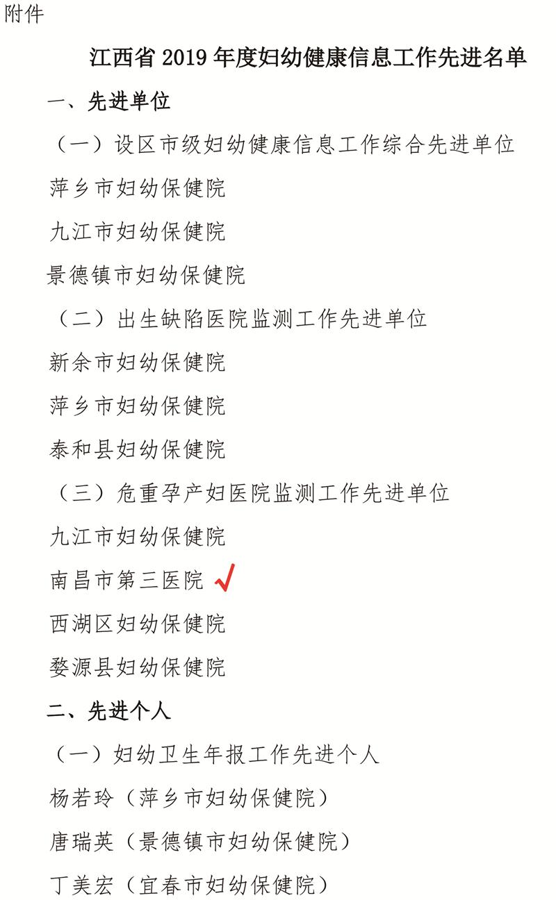 2020年11月23日,捕鱼游戏 被江西省卫生健康委评为2019年度江西省危重孕产妇医院监测工作先进单位,这是继捕鱼游戏 去年获得此项荣誉后再次蝉联。这既是上级主管部门对捕鱼游戏 危重孕产妇救治能力的认可,更是我们今后发展的动力,我们将以此为起点,切实履行区域内危重产妇救治任务,加强救治体系建设,提高救治业务能力,为广大妇女儿童健康提供更优质的服务。
