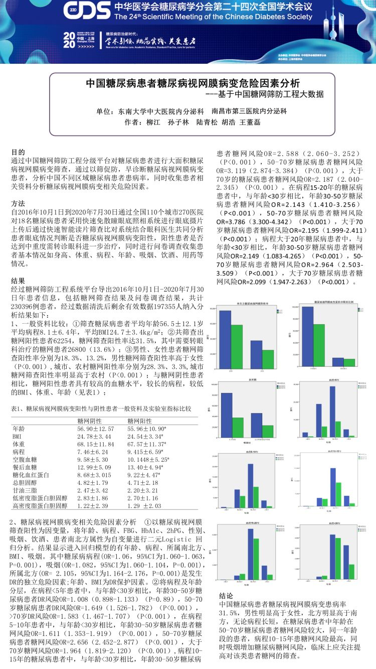 捕鱼游戏 内分泌代谢科柳江博士投稿年会的壁报《中国糖尿病患者糖尿病视网膜病变危险因素分析——基于中国糖网筛防工程大数据》(指导老师:东南大学孙子林教授),经大会专家评定为2020年中华医学会糖尿病学分会优秀壁报,该研究结果来源于中国糖网筛防工程20万人群大数据分析,研究发现,中国糖尿病患者中糖尿病视网膜病变阳性筛查率高达31.5%,男性明显高于女性,北方明显高于南方,无论病程长短,在糖尿病患者中年龄在50-70岁糖尿病患者糖网风险较大,同一年龄段的患者,病程10-15年患糖网风险最高,同时吸烟明显增加糖尿病糖网风险,而戒烟可以减少糖尿病视网膜病变风险最终获益,临床上应关注提高对糖尿病患者糖尿病视网膜病变的筛查力度。