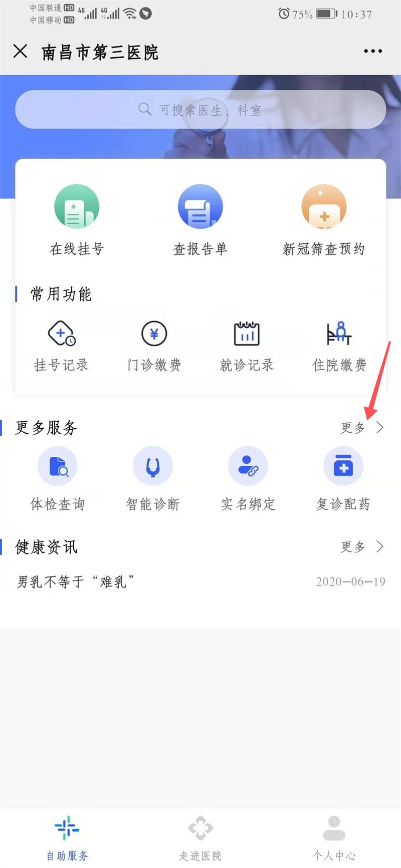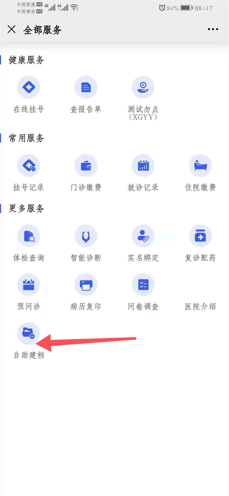 点击“就医服务”——>“捕鱼游戏”——>“更多服务”——>“自助建档”。