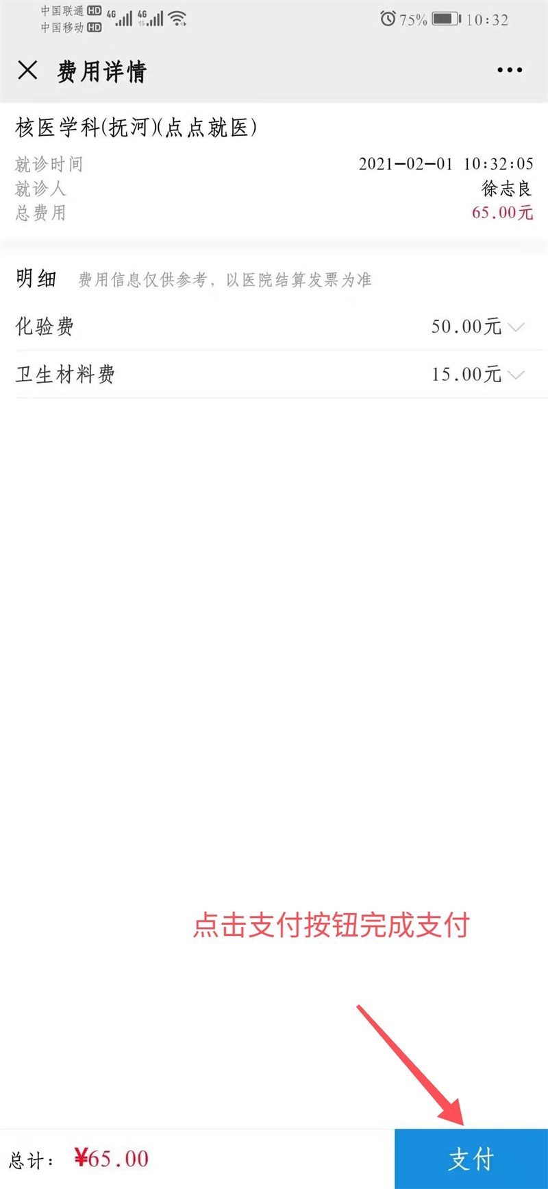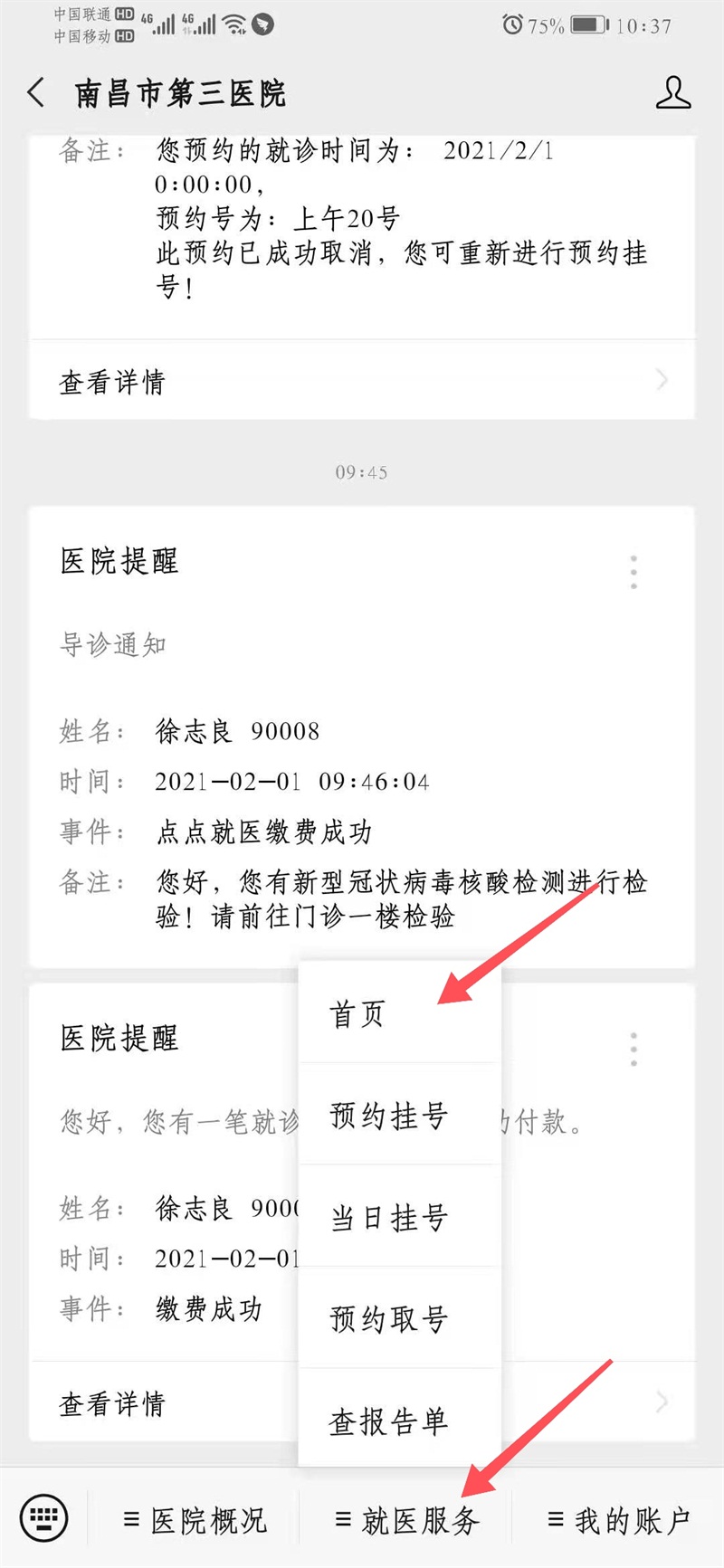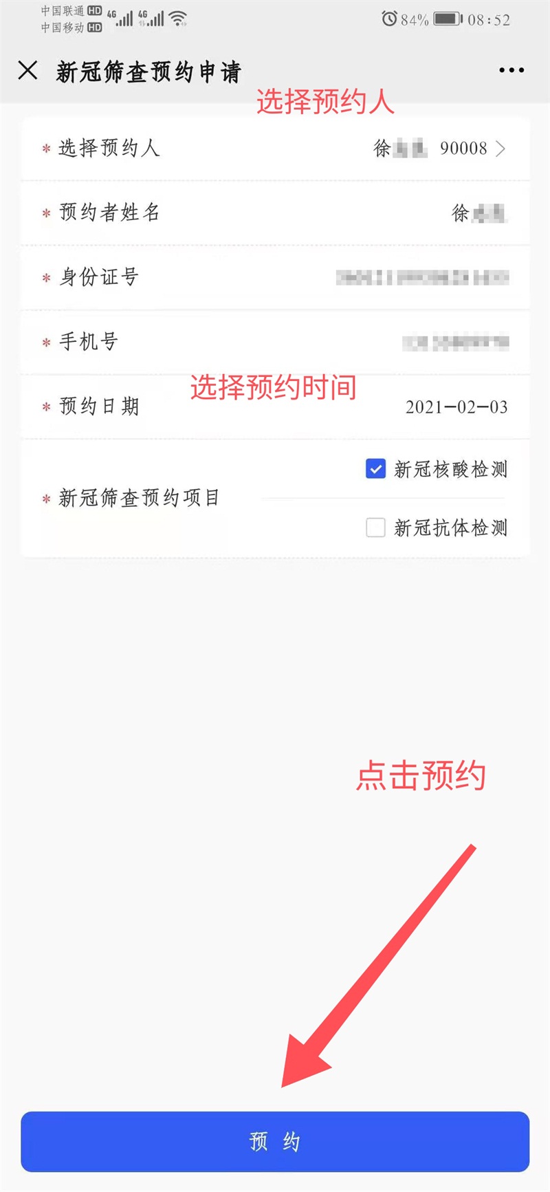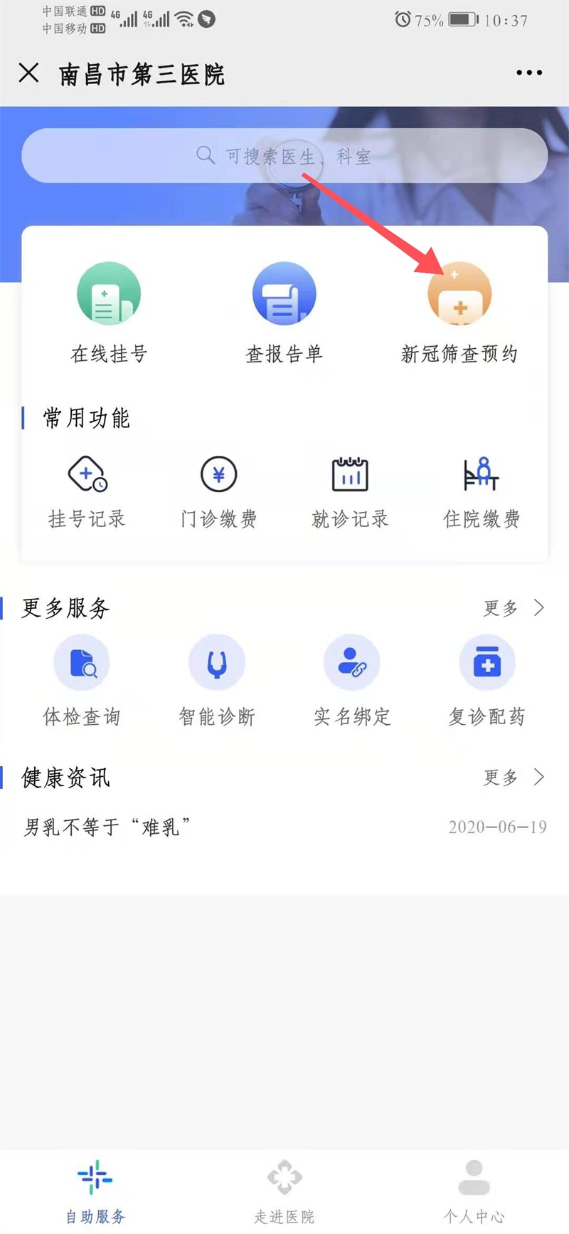 进入公众号下列菜单选择“就医服务”——>“捕鱼游戏”——>“新冠筛查预约”——>“选择院区”——>“选择预约人和时间”——>“点击预约”——>“查看费用详情”——>完成支付。