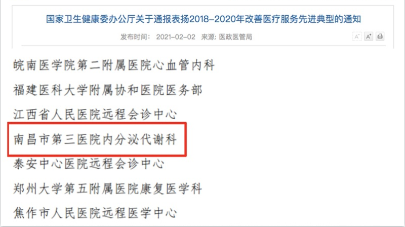 2021年2月2日,国家卫生健康委办公厅公布了“关于通报表扬2018-2020年改善医疗服务先进典型的通知”,捕鱼游戏 内分泌代谢科获得国家卫生健康委2018-2020年“全国改善医疗服务先进典型科室” 荣誉称号。