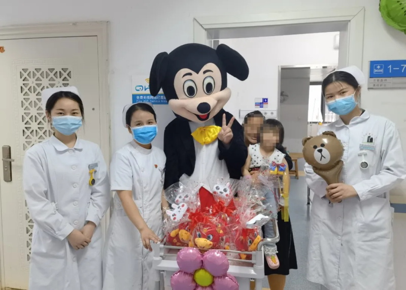 抚河院区儿科医护天团,则牵着米奇先生,来到儿科病房与小朋友们一起欢度六一。
