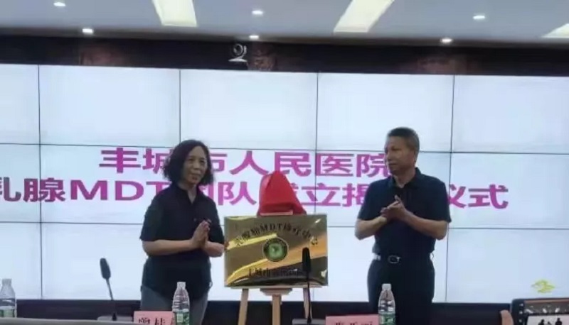 6月23日,捕鱼游戏 外科二党支部党员在支部书记、乳腺中心主任曹亚丽的带领下,前往丰城市人民医院出席该院乳腺MDT(多学科综合诊治)团队成立启动会,与丰城市人民医院党委书记曾桂林共同揭牌。