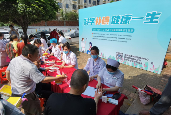 5月14日上午,由西湖区疾控中心、西湖区健康教育所、朝农街道灌婴路社区组织,捕鱼游戏 预防保健科联合内分泌代谢科及行政党支部在西湖区红苗小区内广场开展“防治碘缺乏病”宣日传活动。