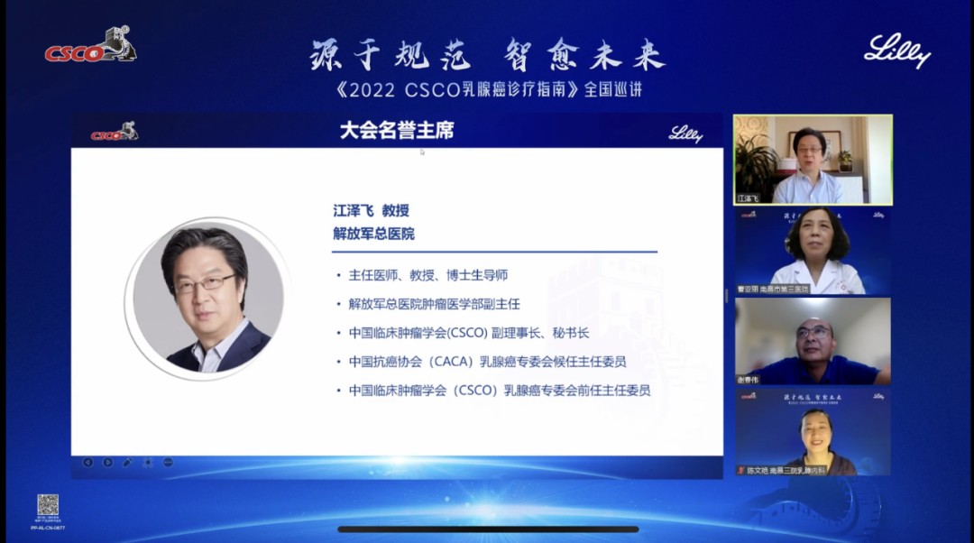 会议还举办了《2022 CSCO乳腺癌诊疗指南》全国巡讲,特邀CSCO乳腺癌专家委员的主任委员、解放军总医院第五医学中心江泽飞教授担任大会名誉主席。来自乳腺专业领域的专家齐聚云端,共同学习CSCO乳腺癌诊疗指南规范,探讨乳腺癌诊疗的典型病例,一起为患者得到更规范的治疗共同努力!