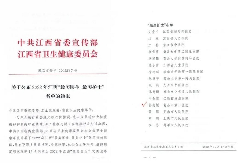 近日,中共江西省委宣传部、江西省卫生健康委在全省卫生健康系统开展了2022年“最美医生、最美护士”学习宣传活动,经自下而上组织推荐、专家评审、社会公示等环节,共评选出30位最美医护,捕鱼游戏 妇幼党支部副书记、抚河院区妇产科护士长郭莉媛被评为“最美护士”。